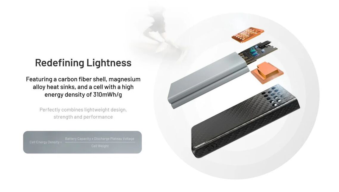 Material: Carbon fibre shell + magnesium alloy heat sinks