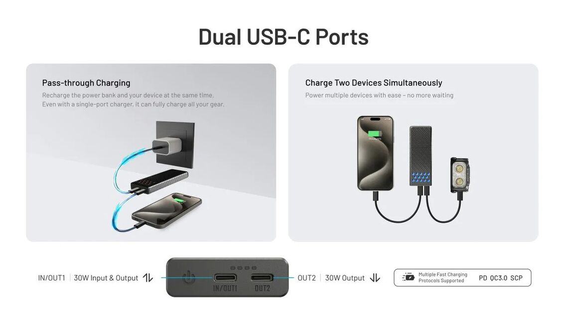 Output (USB-C × 2): 5 V⎓3 A / 9 V⎓3 A / 12 V⎓2.5 A (30 W max)