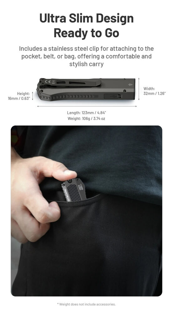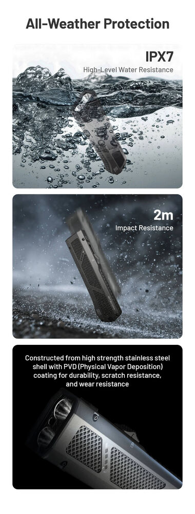 Stainless steel shell, PVD coating, ceramic glass breaker, the EDC17 feels like the sort of torch you’d toss into the ute tray without a second thought. IPX7 waterproofing and 2-metre impact resistance mean it won’t sulk if the weather turns or you drop it on the driveway. And it’s slim enough (16–20 mm) to disappear in the pocket without that awkward “what’s that lump?” look.