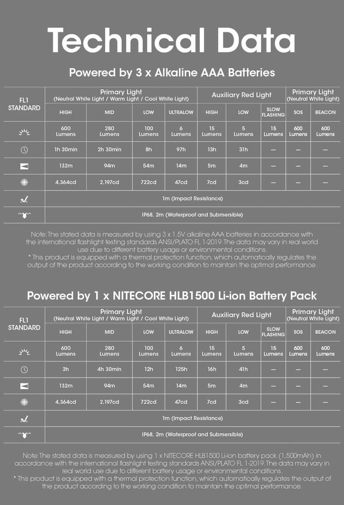 Note: The max runtime is measured by using a NITECORE HLB1500 Li-ion battery pack.