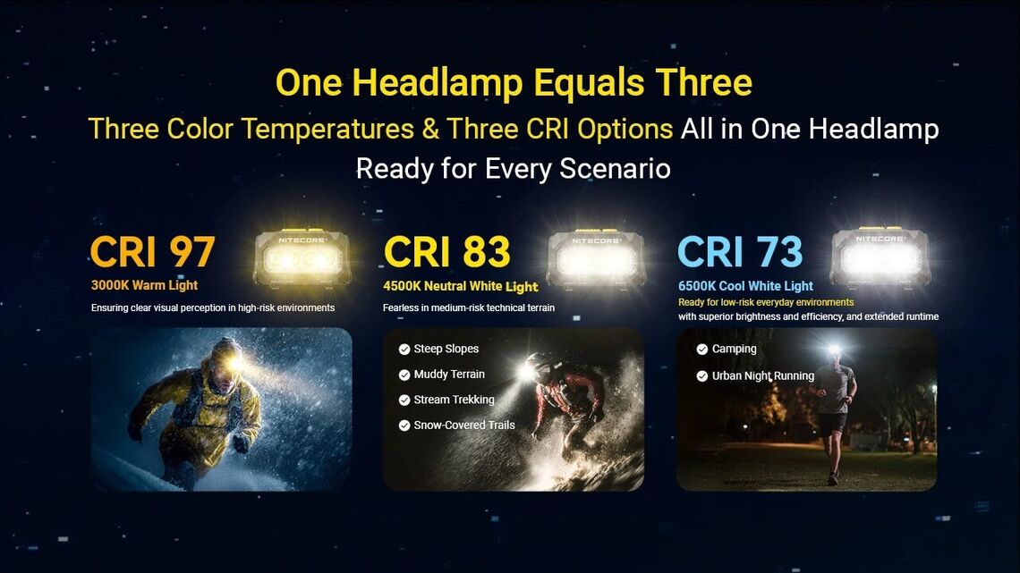 The Nitecore HA27 UHE headlamp is designed for outdoor users who care about how they see, not just how bright their light is. Instead of locking you into a single harsh beam, the HA27 UHE offers three selectable color temperatures - warm, neutral, and cool - so you can choose the right light for the task at hand. From relaxed camp chores to active night movement, it delivers comfortable, eye-friendly illumination you can rely on for hours.
