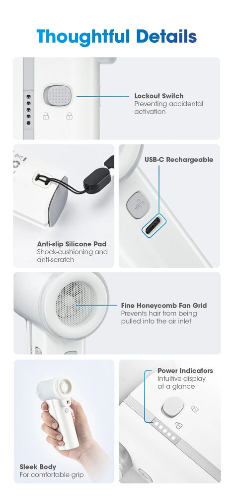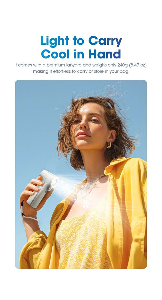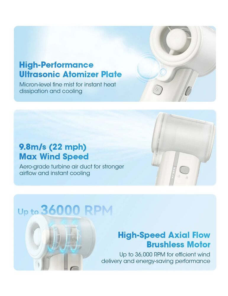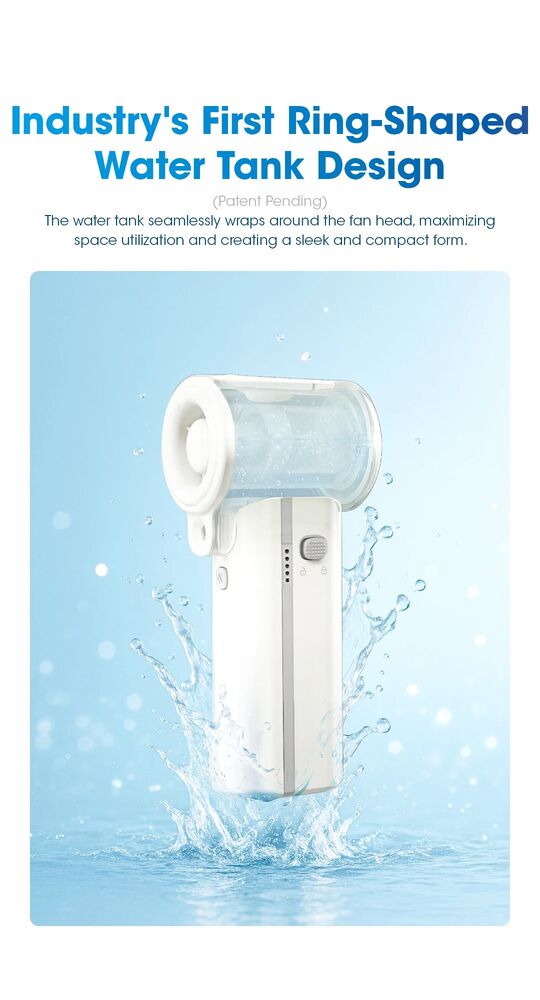 With a 36,000 RPM motor and up to 9.8 m/s airflow, it’s no lightweight. Add that 50 mL/h mist output and suddenly you’re walking around with your own tiny nor’west breeze. The ring-shaped water tank is a tidy design.