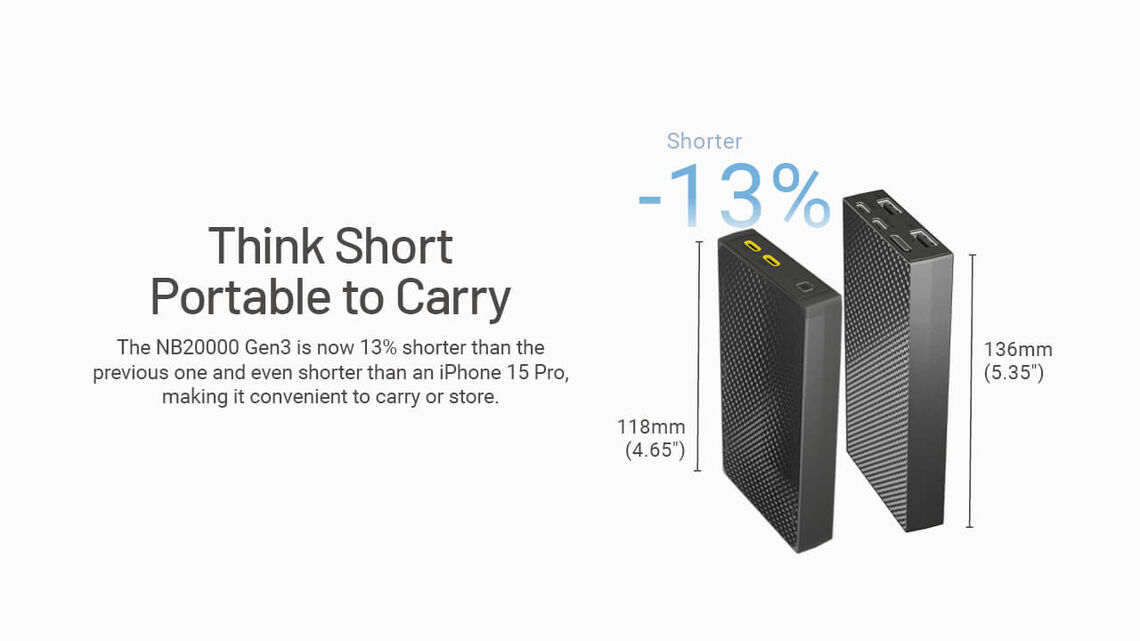 The NB20K is 27% lighter than conventional power banks and compact enough to slip right into your pocket, with a sleek modern minimalist design.