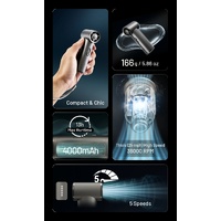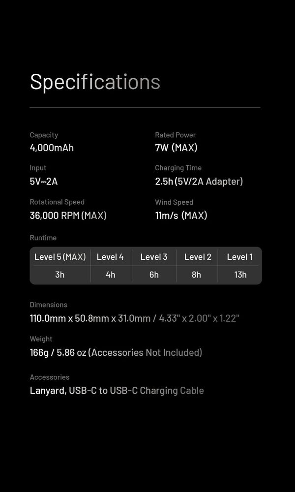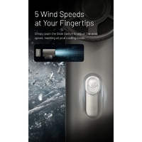 The beast in your hand: solid aluminium body, 166 g weight, five-speed slider switch and a savage 11 m/s wind at max. Whether you're busting out on the boat, under the sun or just trying not to melt in the shed — this little bad boy’s got your back.