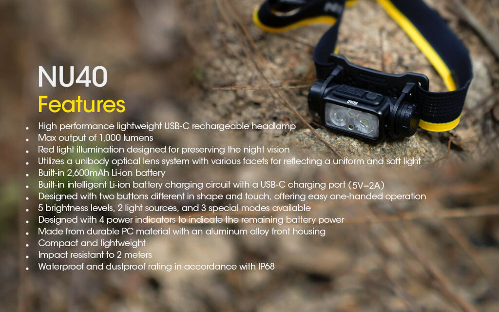 Looking for a bright headlamp that can handle any outdoor adventure? Look no further than the Nitecore NU40. Weighing in at just over 113 grams, this headlamp packs a powerful punch with a maximum output of 1000 lumens and a beam throw of over 100 meters. Plus, it's got a spotlight for long-distance vision, a floodlight for up-close tasks, and an auxiliary red light to protect your night vision or use as a signal light. This headlamp is lightweight and waterproof, making it the perfect companion for all your outdoor shenanigans.