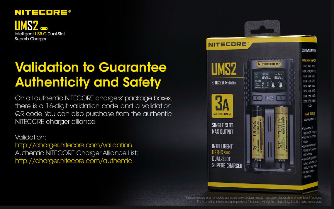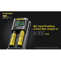 The Nitecore UMS2 Intelligent USB-C dual-slot charger is designed to recharge your batteries fast, safe and efficiently. The UMS2 will reach a maximum total output of 4000mA when using a 2A output USB power adapter. When the charger is powered or connected to quick charge (QC) power adapter, the screen will show “Quick Charge” and the single slot will achieve a max output of 3000mA.