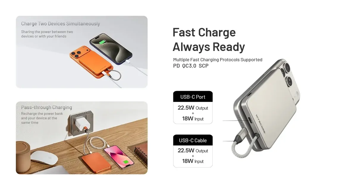 YOU ACTUALLY FORGET IT'S THERE - This sits flush against your phone like a slim case rather than a bulky battery pack. The metal body dissipates heat efficiently, so it stays comfortable even during fast charging output.