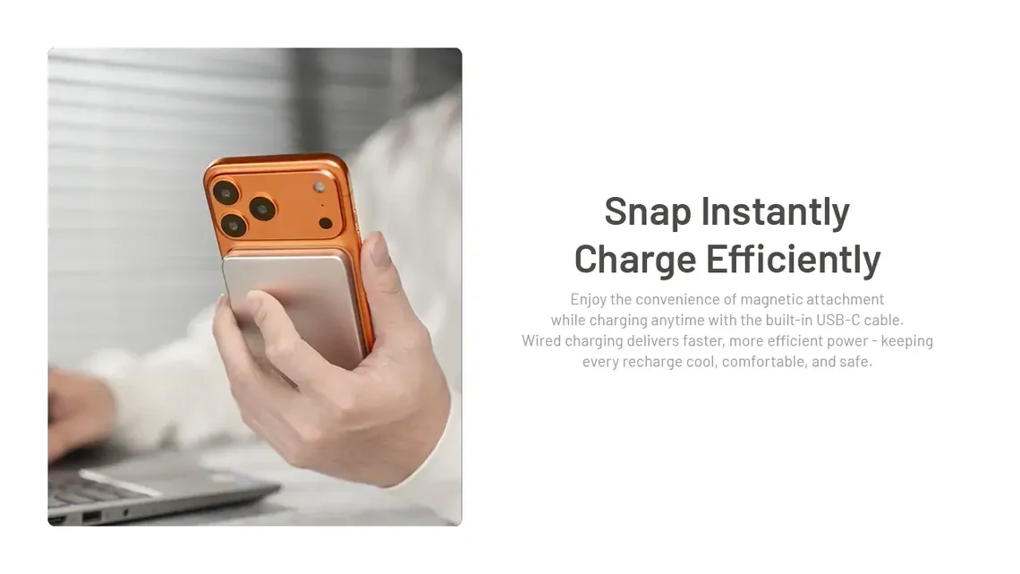 IT JUST SNAPS ON AND WORKS - Pull the integrated cable out of its storage slot, snap the power bank magnetically to the back of your phone, and plug in. That's it. One hand, one motion, and you're charging while you keep walking, texting, or navigating.